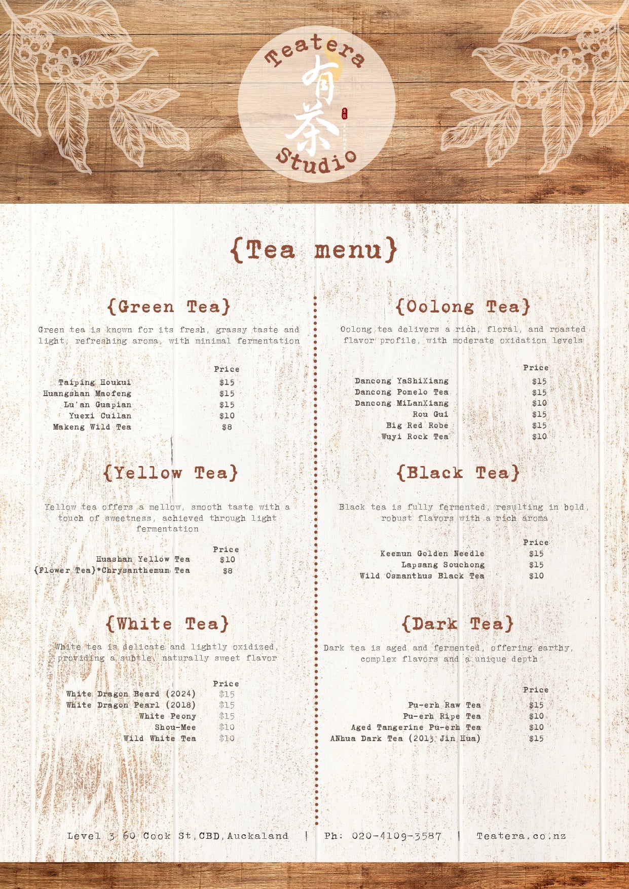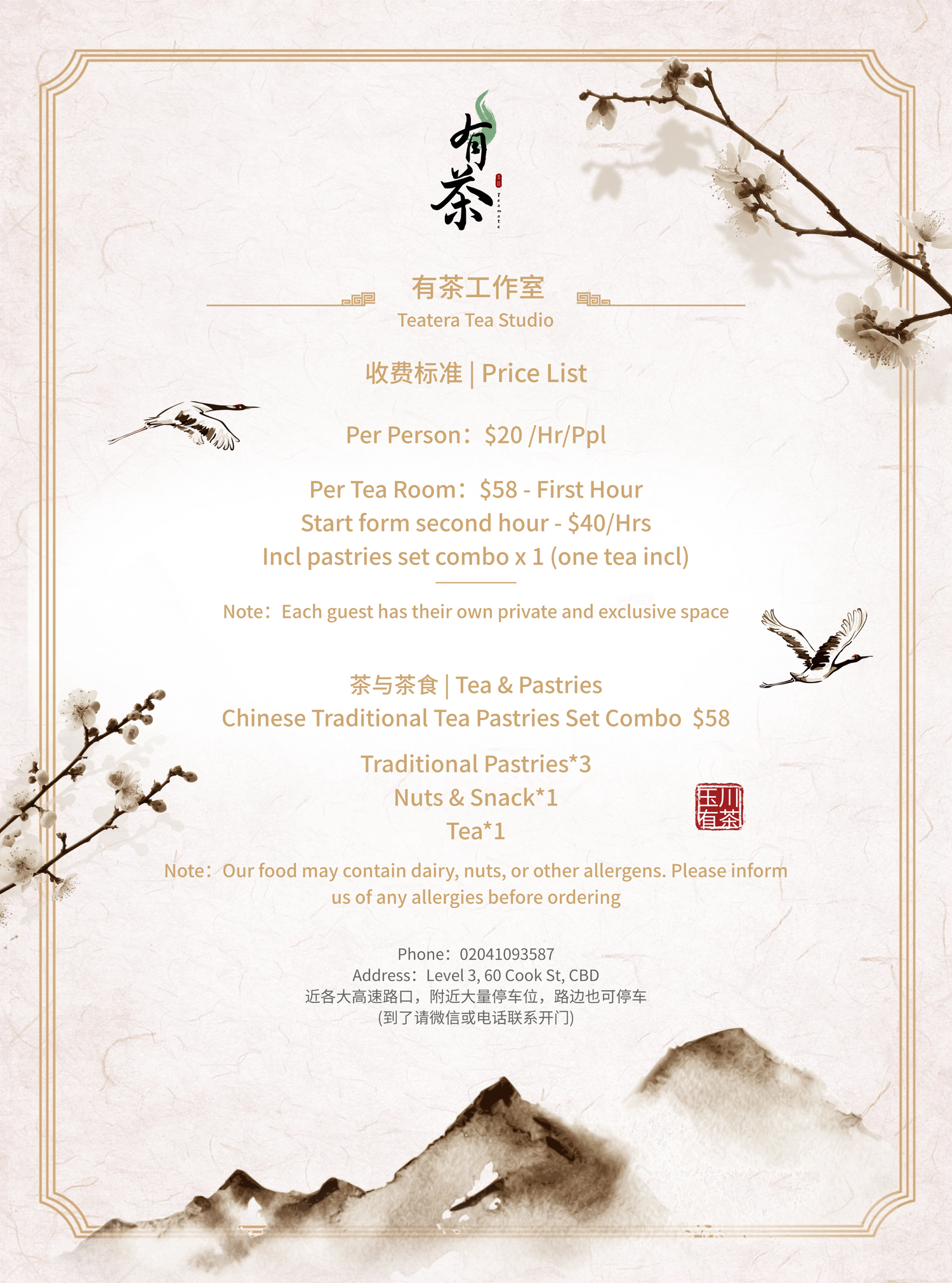 Enjoy tea options at Teatera Tea Studio: $20 per person per hour or $58 for a private tea room (1st hour includes tea and pastries). Notify us about allergies. Contact for queries or adjustments.
